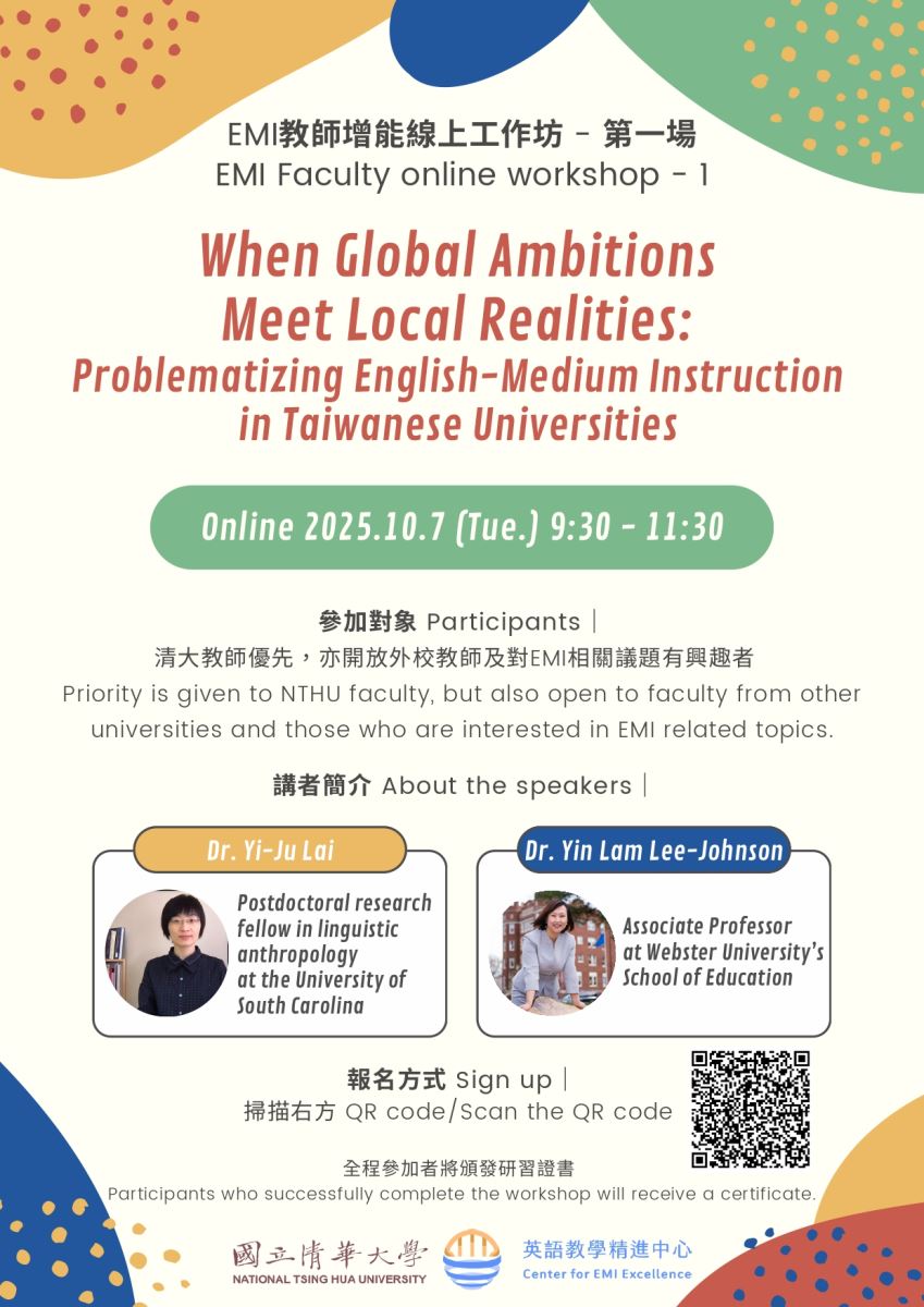 114.10.17 (二) 清華大學EMI中心辦理EMI 教師增能線上⼯作坊