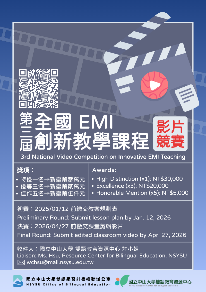 National Sun Yat-sen University is pleased to announce the Third National Video Competition on Innovative EMI Teaching. Faculty are invited to design unit-based lesson plans and submit corresponding videos that demonstrate EMI teaching in real classroom settings.